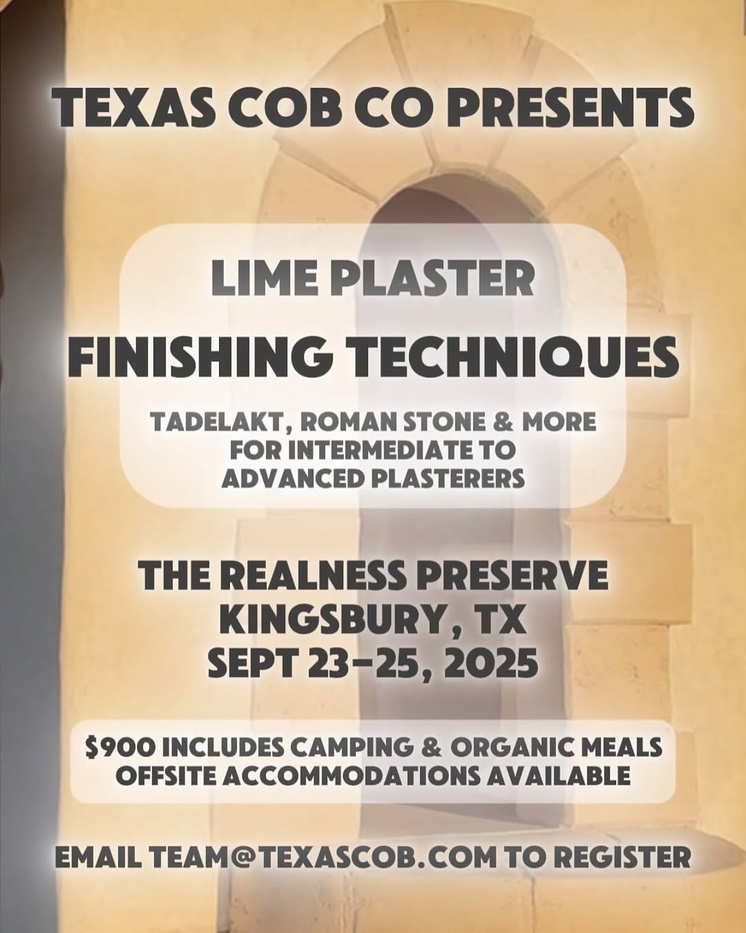Texas Cob Co presents a 3-day intermediate to advanced Lime Plaster Finishing Techniques workshop, covering tadelakt, Roman stone and more advanced finishing methods. This workshop is designed for experienced plasterers looking to expand their skills with advanced lime plaster finishing techniques.